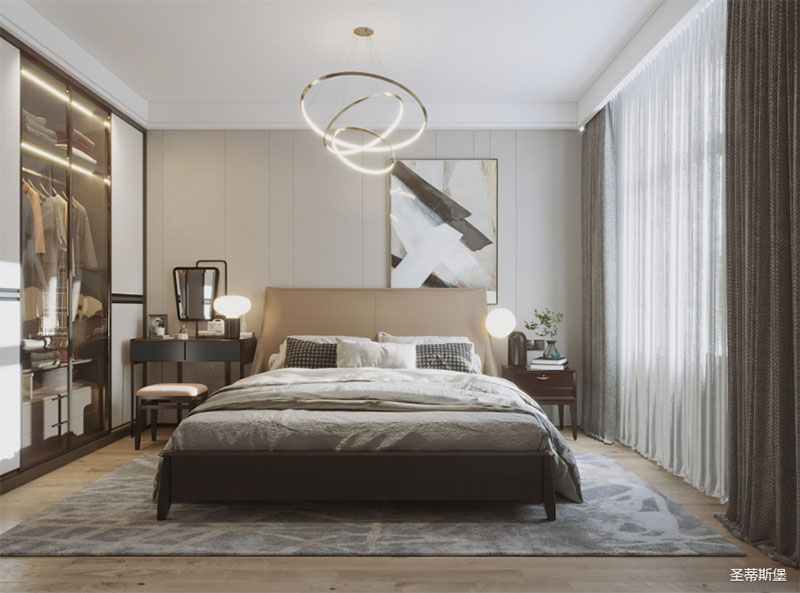 灵活变装的主卧空间,自成独特的设计语言与真挚的感情糅合。经典意式极简软床,流畅顺滑的真皮床屏,赋予了空间温馨高贵的气息。酒红实木质感的床头柜,整齐摆放,欲有“鸿运当头”的美好寓意,塑造出一方简约知性的灵动空间。